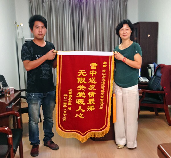 2014年8月25日下午,定海区慈善总会接到汪振明家人所送的锦旗,上面写着“雪中送炭情最深,无限关爱暖人心”。