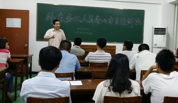 7月23日晚开始,定海区的慈善义工赵翔在舟山市工人文化宫教室为外来务工人员培训舟山方言。培训内容为舟山方言中的称谓、自我介绍及一般日常用语。三十多名来自河南、湖南、湖北、江苏、山东、安徽等不同地方的外来务工人员报名参加了培训。