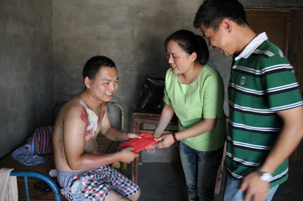 7月29日,定海区慈善总会与定海区流动人口服务管理局一同来到盐仓街道看望烫伤河南籍流动人口肖留建。