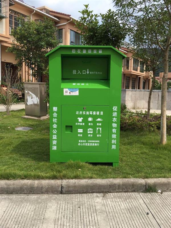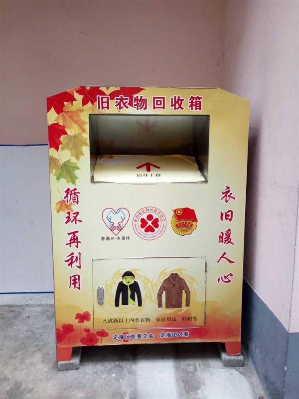 近日,在盐仓街道的富都花园和附近几个小区,以及城区檀东颐景园小区都发现摆放有旧衣回收箱,该回收箱印有“整合社会公益资源”,“政府实施环保项目”等字样,经有关部门调查,箱体上的“舟山市茗莛贸易商行”注册在一个住宅区内,经营范围为超市日用品等,回收旧衣已超出了其经营范围。