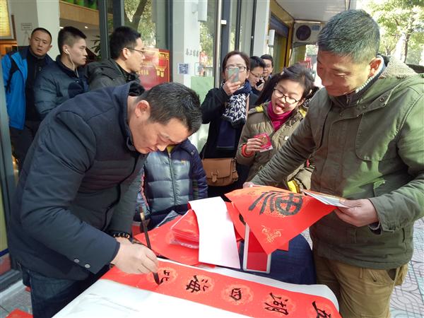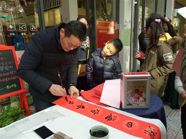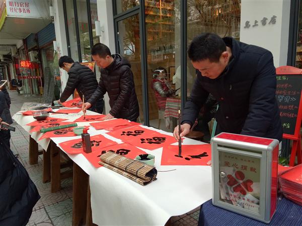 活动邀请了中国书法家协会会员,定海著名书法家胡炳华、王忠军、刘德钦三人,在岛上书店挥毫泼墨,为市民们书写福字和春联,引来众多市民争相参与,现场一幅热火朝天的景象。活动现场还摆放了爱心捐款箱,市民们在领取福字和春联后,可随意在爱心箱内投入爱心款,所有善款将通过总会定向捐献给定海区大病患者。