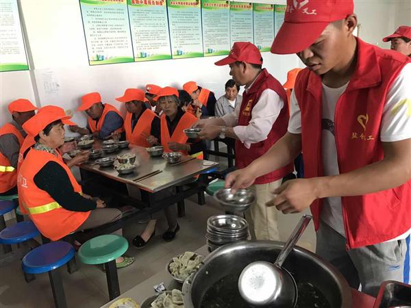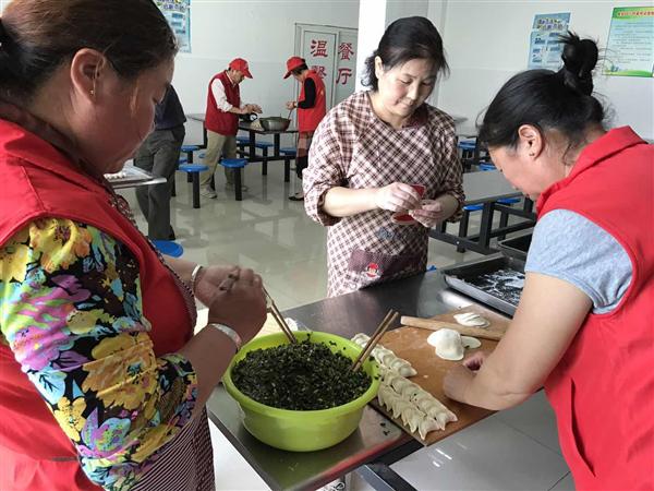 5月13日下午,慈善拥军车队队员和家属以及慈善义工们在蓝天学校食堂为盐仓80名环卫工人包饺子。车队家属们熟练的揉面、擀皮、裹馅,等待着环卫工人们清扫完路面后来享用。下午五时,饥肠辘辘的环卫工人陆续从街上扫地回来,义工们为他们送上了热腾腾的饺子。