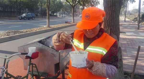 煮熟的饺子用两只保温桶盛着。大家用三轮车运到300米外盐仓环卫所。此时,早出去的环卫工人已经回来了,大家端着热腾腾的水饺,心里特别高兴。“早晨没吃饭,这味道真的好,吃碗饺子,心里热乎乎的。吃饱了好干活。”环卫工人汤师傅说。随后,慈善拥军车队队员推着三轮车,沿路为每位一线环卫工人送上水饺,把温暖传递给冬日里的“城市美容师”。