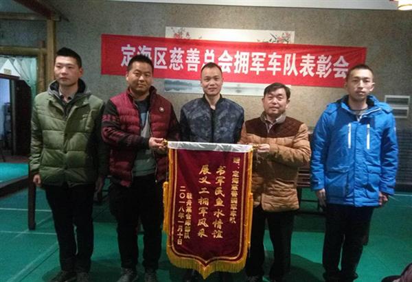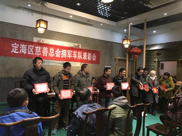 1月10日上午,定海区慈善总会对定海慈善拥军车队有突出事迹的5名优秀驾驶员、8名优秀义工进行表彰。定海区慈善拥军车队本着“奉献、友爱、互助、进步”的义工精神,以丰富多彩的义工活动为载体,服务部队、服务弱势群体、服务社会。一年多来,开展拥军活动,共服务驻舟部队官兵1200人次;开展“爱循环、衣循环”活动8次,把近万件慈善捐衣送到工厂、大桥建设者手中;每月一次到盐仓敬老院包饺子、擀面条,不定时到盐仓敬老院陪老人聊天、打扫卫生,一年来还开展护河41次,护绿60次;有20名队员拾金不昧;去年7月韩军朋用自己的车护送一名病人到医院,因为抢救及时,病人转危为安……
