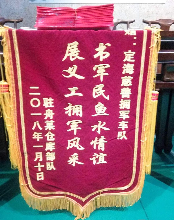 表彰会议上,驻舟某部受伤的战士特地送来锦旗,对队员们表示感谢。部队助理员余雄华说:“我们部队在山上,平时下山打车很困难,现在只要一个电话,拥军车队就把车开到部队门口,大大方便了我们官兵, 通过这些点滴、这些小细节真正体现了军民鱼水情,我祝愿定海慈善拥军车队越来越好!”