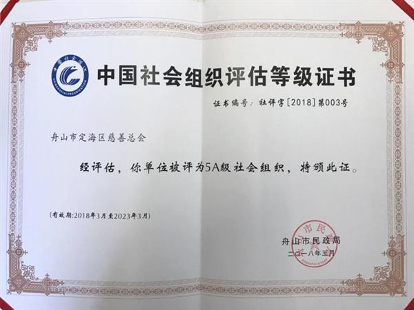 2018年初,总会收到舟山市民政局颁发“中国社会组织”5A级证书,顺利通过复评。