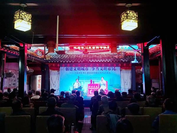 舟山市定海老城区中大街——舟山最具文化底蕴的古街之一。在中大街63号的古城非遗文化曲艺馆,省级非物质文化遗产——翁洲走书的传统曲目《福寿大红袍》正在精彩上演,台下120余位老人凝神观看,走廊边也坐满了人。