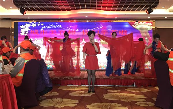 桌上美酒佳肴,台上欢歌热舞,1月24日中午,200位环卫工人在定海怡东凯丽大酒店宴会厅喜吃慈善年饭。这场由定海区慈善总会主办、区综合行政执法局慈善分会协办的慈善年饭活动,温暖了“城市美容师”的心。