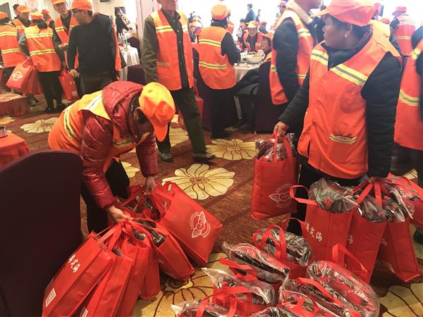 一品福肉、本鸡煲、雪汁大黄鱼、葱油鲈鱼……20桌环卫工人边吃边拉家常。省道德模范、省优秀“城市美容师”钟耿平在工作中7次跳海救人的英雄事迹被同事点赞。55岁的钟耿平负责定海海滨公园的保洁工作,包括春节在内一年365天无休,每天工作时长超过10个小时。他说:“平时大家都忙,见面也只能打个招呼。非常感谢政府部门和爱心单位的关爱,让大伙能聚一聚。 ” 53岁的广西人杨美金,8年前跟女儿来到舟山后,一直从事环卫工作,负责定海蟠洋山路段。“舟山这座城市对我们很关心,今年还要继续好好干。 ”她说。“今天是腊月十九,我代表区政府向大家拜个早年,感谢你们一年来的辛勤付出!定海作为创城的主战场,这份付出大家看在眼里、记在心里,我向你们道一声辛苦了! ”定海区政府领导也来到慈善年饭现场,感谢“城市美容师”为创城作出的贡献,这让在座的城市美容师心底升起一股暖流。定海区慈善总会常务副会长黄静介绍,该会已连续6年举办慈善年饭,往年受益群众主要是敬老院老人,今年首次给“城市美容师”举办慈善年饭。怡东凯丽大酒店免费为环卫工人提供了价值4.5万元的20桌酒水佳肴。宁远海运有限公司向环卫工人赠送了200套总价值5万元的御寒冬衣。定海区慈善总会的慈艺爱心演出队为环卫工人献上了一场公益演出。吃完慈善年饭,不少“城市美容师”又匆忙返回工作岗位。相互告别时,大家许下了一个共同的心愿:“新一年,让城市更美一些。 ”(转于舟山日报)