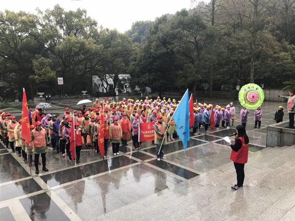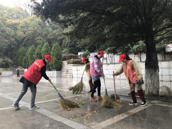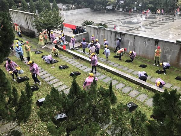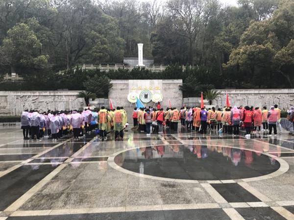 义工们首先向纪念碑敬献花圈、致敬默哀,随后分成四组人员到墓区不同角落开始清扫活动,天空一直下着绵绵细雨,但义工们一个个认真擦洗墓碑,捡拾垃圾,清理枯枝杂草。经过两个多小时的劳动,烈士陵园的内外环境焕然一新。