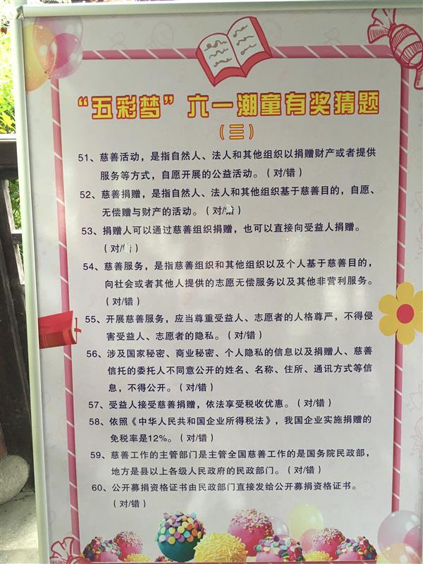 六一儿童节来临之际, 5月26日上午,区慈善总会联合区关工委在金平颐景园小区开展“五彩梦”六一潮童有奖猜题活动。