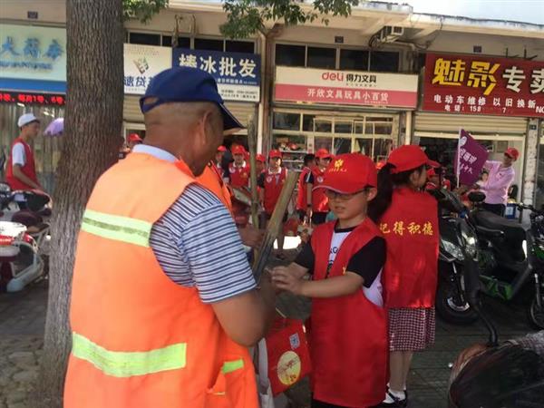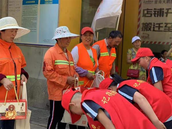 下午,小朋友们又冒着炎炎酷暑,带着“清凉包”看望烈日下辛苦工作的环卫工人向他们送去夏日中最凉爽的爱意,并对他们致以深深的敬意。