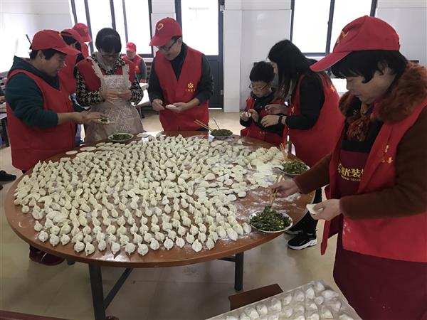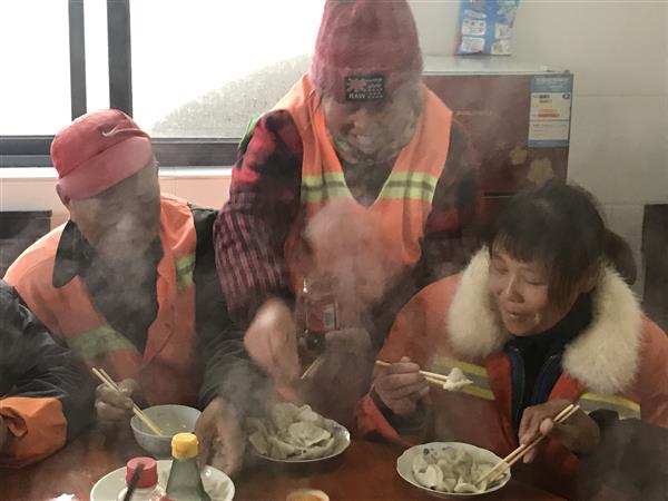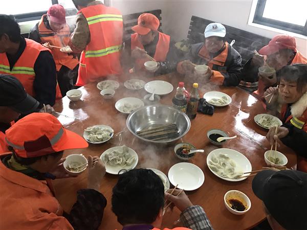 冬至来临,俗话说:“不端饺子碗,冻掉耳朵没人管” 。按照中国传统习俗,冬至家家户户都要包饺子、吃饺子。12月21日上午,定海区慈善总会和定海区慈善拥军车队的志愿者们,就来到定海解放环卫所为环卫工人包饺子,把温暖送到他们身边。早晨6点,解放环卫所的二楼食堂里已经热热闹闹,志愿者们早早来到这里,和面的和面、擀皮的擀皮、包饺子的包饺子,3个小时后,2000多只精巧的爱心饺子就摆满了桌子。“这些食材都是我们志愿者自己买的,从昨天下午就开始准备了。本来需要8名志愿者帮忙,没想到一下子来了12名。”定海区慈善拥军车队队长吴发喜说,环卫工人是“城市美容师”,非常辛苦,刮风下雨都坚持工作,天冷了也吃不上一口热乎饭,开展这个活动,就是要让环卫工人感受来自社会的温暖。“我们也想用自己的行动,号召大家都来尊重环卫工人,尊重他们的劳动成果,爱护我们共同的环境。”上午10点,上早班的环卫工人都陆续回到环卫所,这时候热腾腾的饺子也出锅了。大家围坐在一起,吃着热腾腾的水饺,感受着这浓浓的人情味儿。河南籍环卫工人陈师傅:真香,香!老家的味道都吃出来了。感谢他们,感谢志愿者!安徽籍环卫工人赵阿姨说,每年冬至都有好心人来慰问她们,她们赶到很暖心。“说明俺环卫工人的地位高了,大家尊重我们,我们更要把环卫工作做好。”