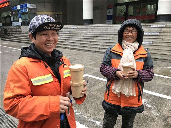 1月2日上午,总会冠名基金舟山第一百货“百爱基金”在城区交通路口、双拥广场、北门菜场等地点开展腊八节送爱心腊八粥活动。工作人员一大早就准备了128盒腊八粥,并把香浓的腊八粥送给环卫工人,向他们送上节日的问候。喝到暖暖的腊八粥,环卫工人们笑容满面,连声说道:谢谢你们,好吃!
