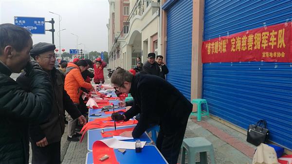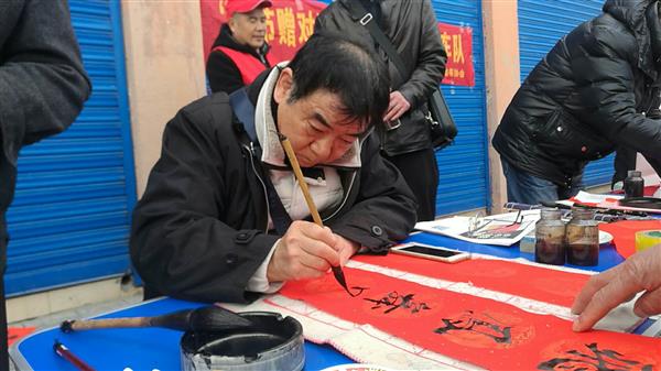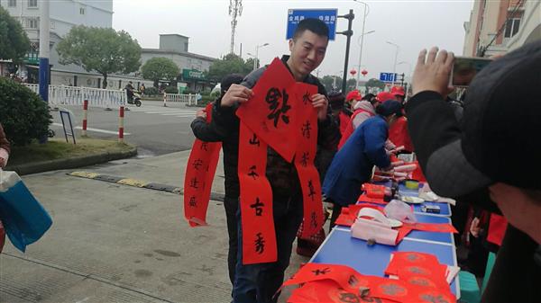 “神州大地山山秀,钢铁长城处处新”、“祖国山河金汤固,华夏千年虎龙踞”……一幅幅带着墨香的春联受到大家的欢迎,2个小时不到,志愿者们就送出了200幅春联。