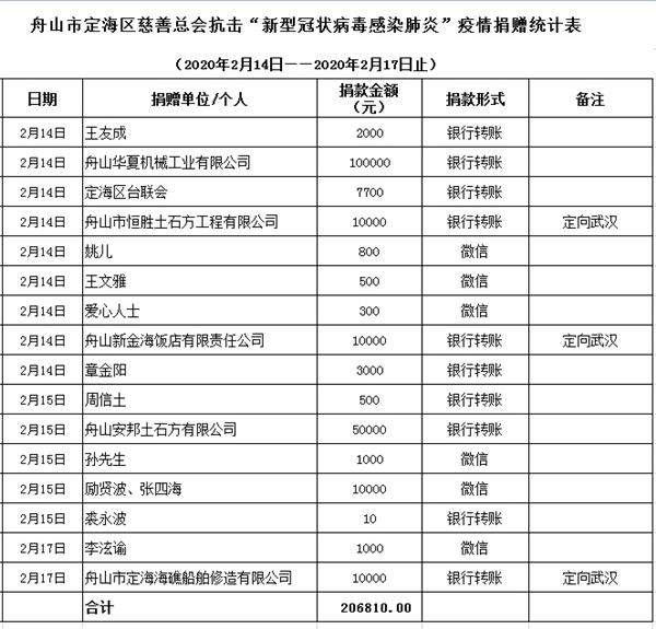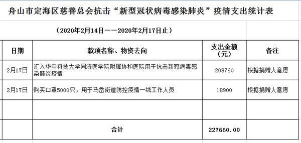 定海区慈善总会2月14-2月17日防控新冠肺炎疫情捐赠款收支公示