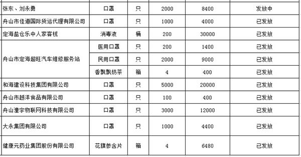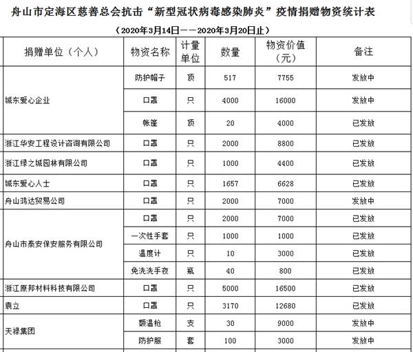 定海区慈善总会3月14日-3月20日捐赠物资公示