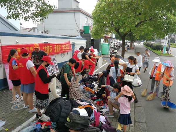 7月27日下午,定海区慈善拥军服务队的15名志愿者在盐仓街道海龙农贸市场门口摆摊,2000多件夏衣和秋衣被新居民挑选一空。