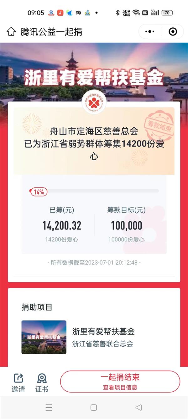 2023年助力“两个先行”浙江慈善专场活动是由浙江省民政厅、浙江省乡村振兴局指导,浙江省慈善联合总会主办,腾讯公益慈善基金会提供资源和技术支持的互联网公益区域专场捐赠活动。为更好地推动该项活动顺利开展,6月25日至6月30日,省慈善联合总会发起“浙里有爱帮扶基金”项目,定海区慈善积极动员慈善分会、慈善公益团队、爱心企业、爱心人士参与“定海慈善总会”专项募捐活动,倡导大家发扬乐善好施、扶弱济困的慈善精神,踊跃捐款。在共同努力下,定海共募集资金1.42万元,参与人数757人次。省慈善配捐1万元。本次筹集爱心善款将全部用于“元旦、春节慰问活动”“浙里护苗同心筑梦行动”“夕阳红行动”“慈居工程”“儿童大病救助”“老年公共浴室”“慈善爱心食堂”等,救助对象覆盖受灾群众、留守(困境)儿童、五老人员、伤残或困难退役军人、低保(低边)家庭、残疾人家庭、事实无人抚养儿童、留守(困难)老年群体、大病儿童等。