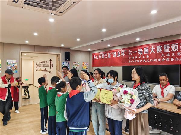 定海区关工委主任、原定海区人大常委会副主任郝理金,定海区慈善总会常务副会长曾莉群等领导参加了颁奖仪式。来自市明珠学校、定海和普陀育才学校、定海金塘柳行小学、普陀小学、勾山小学、城西小学等9所中小学校近90名嘉宾、获奖学生、指导老师及学生家长齐聚共庆佳节,并认真欣赏了获奖绘画作品。