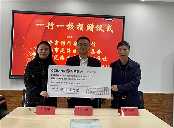 11月25日下午,定海区慈善总会、浙商银行舟山分行等相关负责人来到岑港中心学校,三方签署了“一行一校”结对帮扶项目定向捐赠协议书,浙商银行舟山分行向定海区慈善总会捐赠了20万元爱心款,定向用于帮扶定海岑港中心学校建设,困难学生补助、优秀学生奖励等。